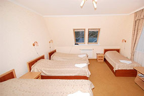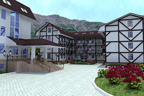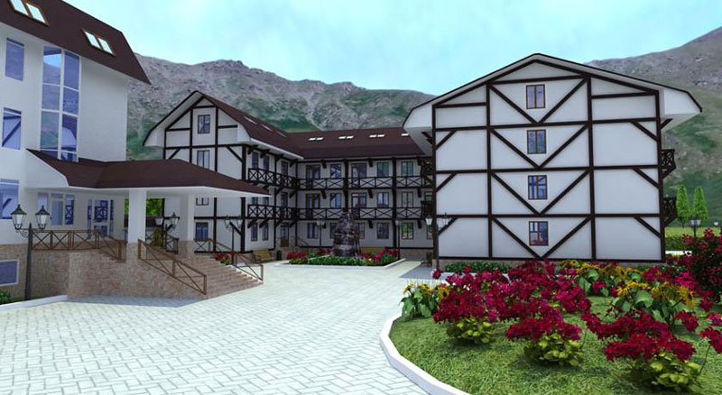 Одновременно может принять 300 отдыхающих. Два корпуса четырехэтажных объединены переходом, два коттеджа(в каждом есть своя сауна) включают еще и ряд инфраструктур: кальян-бар(оформленный в восточном стиле), диско-бар, ресторан(оформленный в классическом стиле, в котором мы можем предложить блюда традиционной национальной кухни Кабардино-Балкарии) ,сауна, бильярд, прокат лыжного снаряжения, прокат коньков и сноубордов, санок, сушилка для обуви, прачечная.