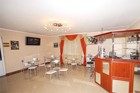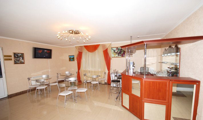 На 1-м этаже пансионата находится уютный кафетерий, где отдыхающие могут отведать чай с добавлением облепихи, барбариса и различных сортов джема, а также предоставляется выбор разнообразных сортов кофе. Возможен заказ в бильярдную, сауну, Интернет-салон.