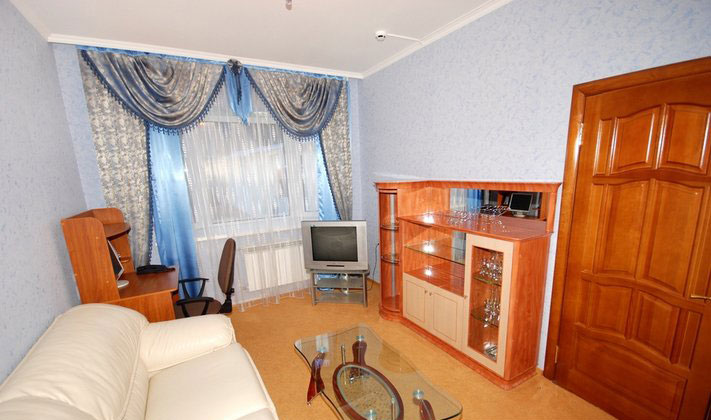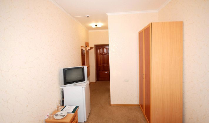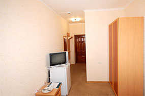 широкая двуспальная кровать, прикроватные тумбы, шкафы для одежды, мягкая мебель, телефон, телевизор (спутниковое телевидение), холодильник, мини-бар, персональный компьютер с выходом в Интернет.